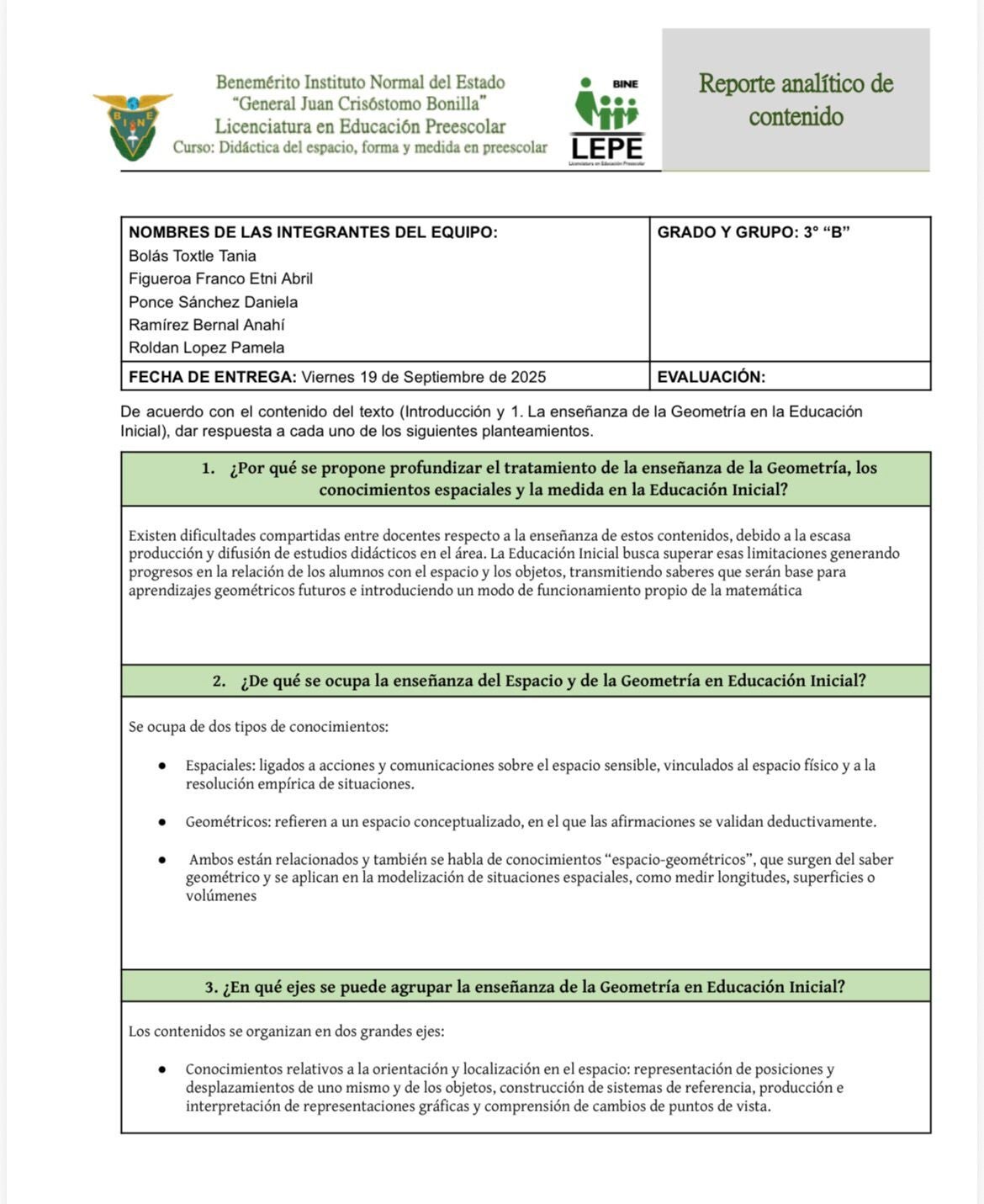 La actividad consistió en la elaboración de un reporte analítico de contenido a partir del texto de Quaranta y Ressia de Moreno (2009), centrado en el enfoque didáctico de la enseñanza de la geometría en la Educación Inicial. El equipo respondió a 17 planteamientos clave que abordan desde la fundamentación teórica hasta las implicaciones prácticas del trabajo geométrico en el aula preescolar.